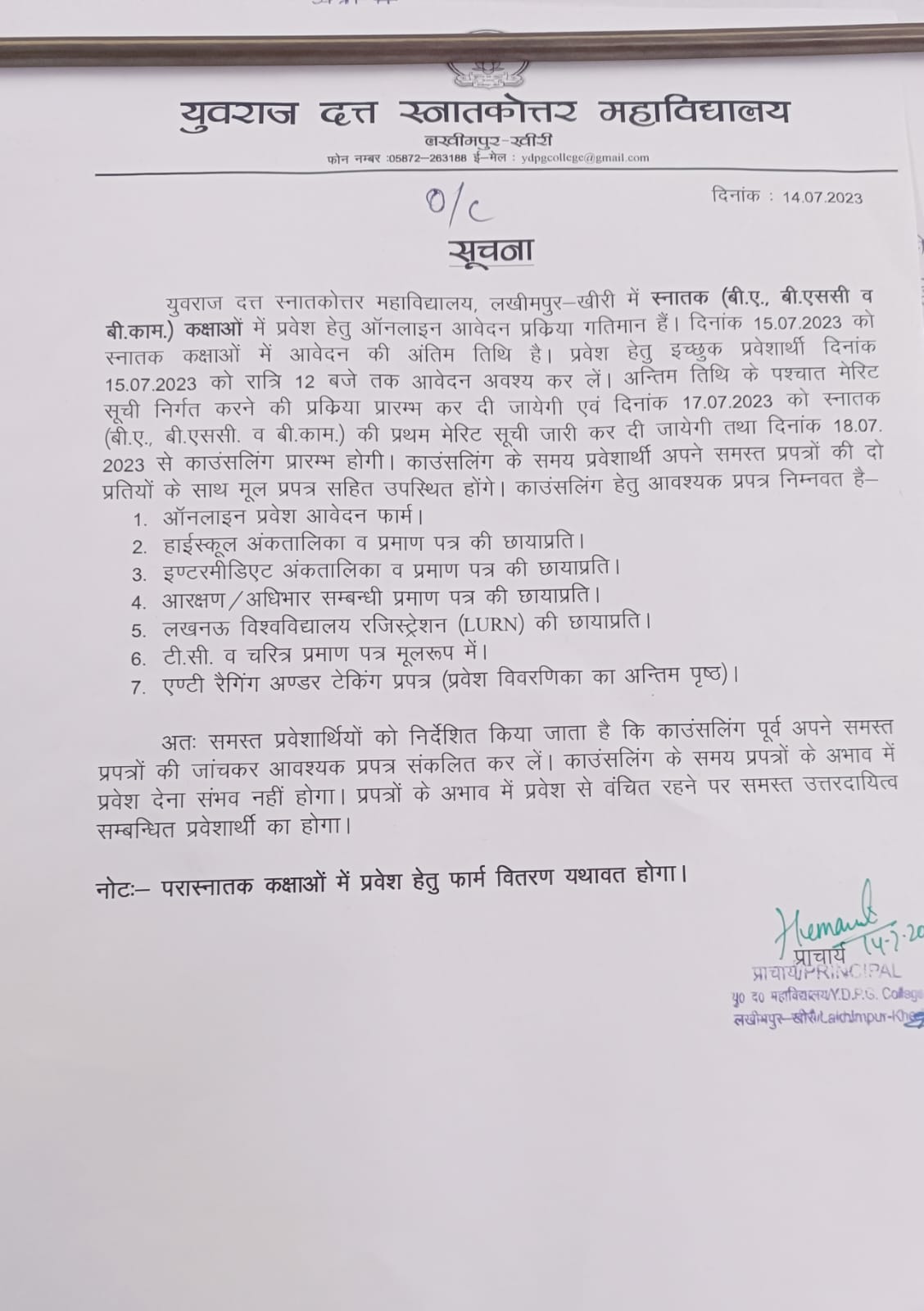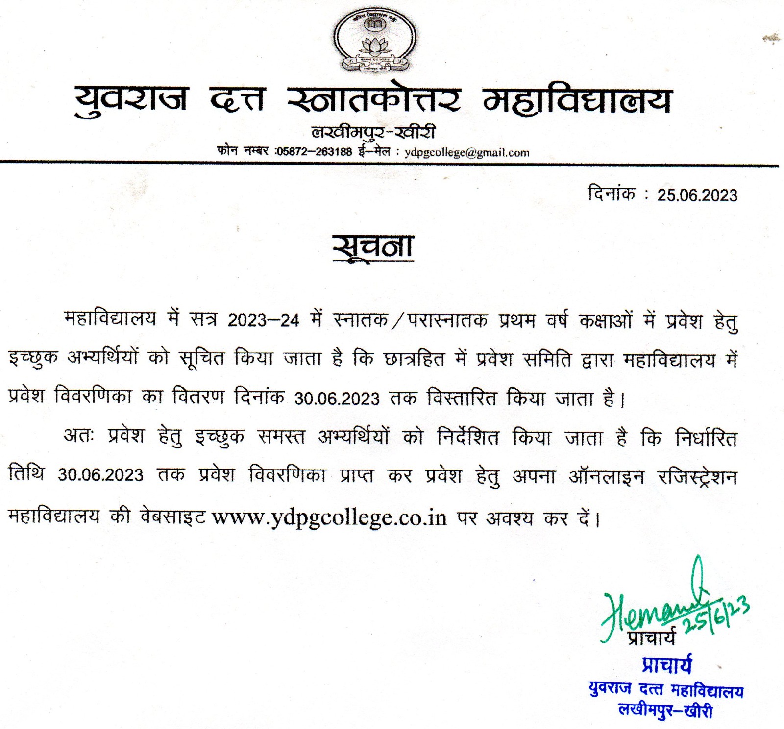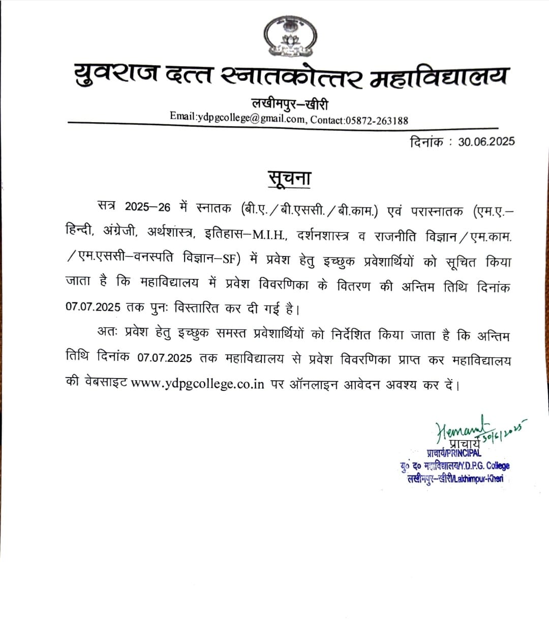 Admission date extended till 21-07-2022 for admission in first year for U.G and P.G Courses