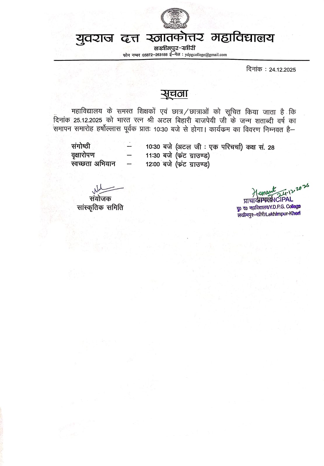 рд╢реНрд░реА рдЕрдЯрд▓ рдмрд┐рд╣рд╛рд░реА рдЬреА рдХреЗ рдЬрдиреНрдо рд╢рддрд╛рдмреНрджреА рд╡рд░реНрд╖ рдХреЗ рд╕рдорд╛рдкрди рдкрд░ рджрд┐рдирд╛рдВрдХ 25-12-2025 рдХреЛ рдХрд╛рд░реНрдпрдХреНрд░рдо рд╕реВрдЪрдирд╛ ред